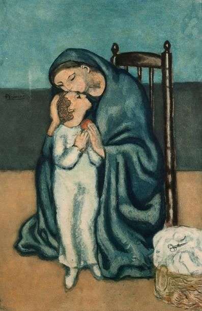Maternité d'après Picasso (Ginestet et Pouillon E 670) 64,5 x 42 cm. Aquatinte en couleurs, tirage de la Chalcographie du Louvre. Légères rousseurs, bonnes marges. Cadre. expert: Madame Collignon 01 42 96 12 17