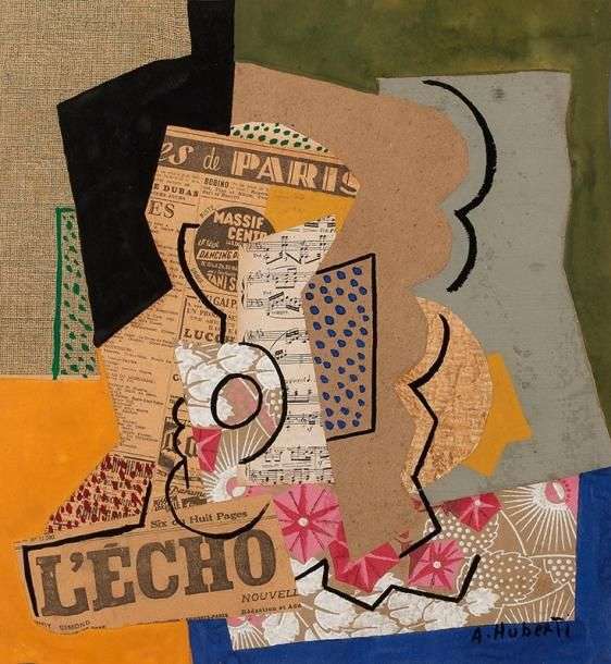 Nature morte aux liserons roses Technique mixte et collages, signé en bas à droite 37 x 34.5 cm à vue