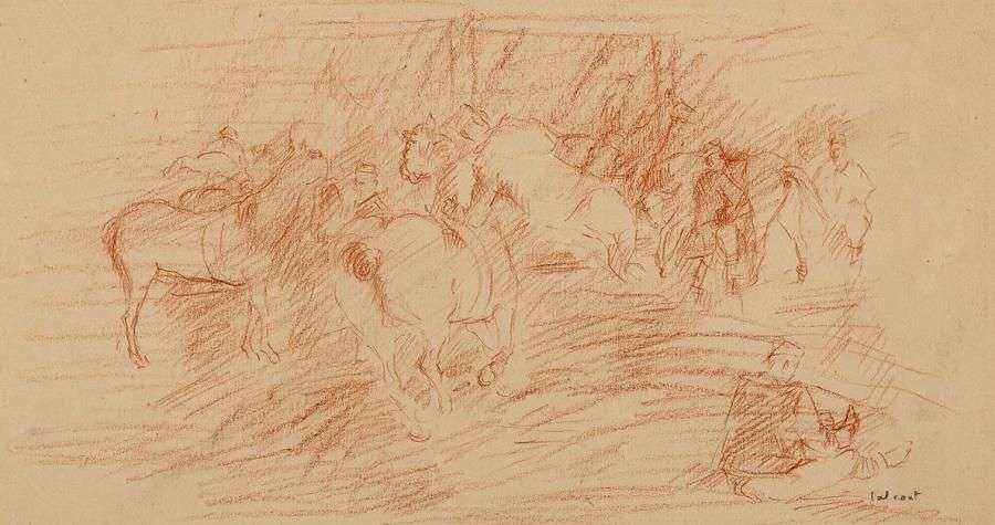 Etude de chevaux et de personnages sanguine sur papier, signée en bas à droite 20 x 37.5 cm à vue