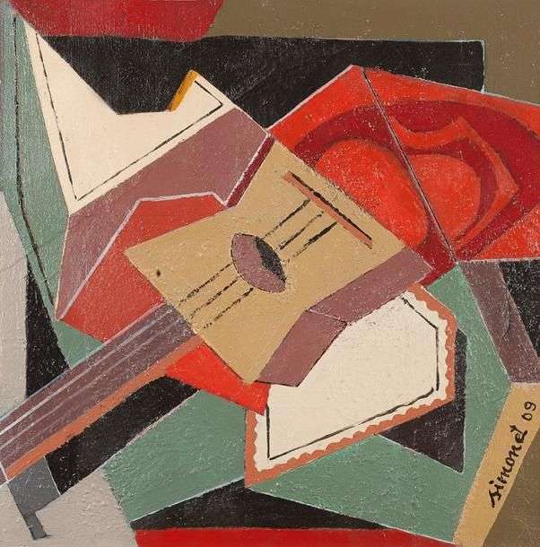 Composition à la guitare, 09 Huile sur toile, signée et datée en bas à gauche 50 x 50 cm accidents au cadre