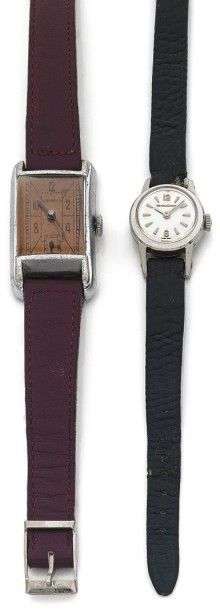 Lot de 2 montres bracelet en métal. Une HERMA rectangulaire année 30. Une JAEGER LECOULTRE ronde acier dame vers 1960. Dans l'état.