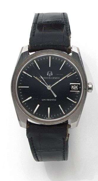 Modèle homme rond en acier. Cadran noir, index et aiguilles bâtons. Mouvement à diapason. Boitier deux corps. Date à 3h. Dim 33mm.