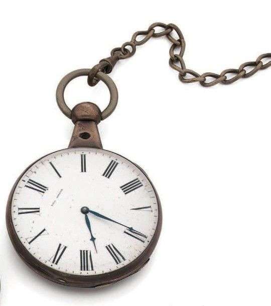 Montre de poche argent avec sa chaine giletière. Cadran émail, chiffres romains, aiguilles acier. Mouvement à cylindre. Poids brut 145,2 gr. Diam 54mm.