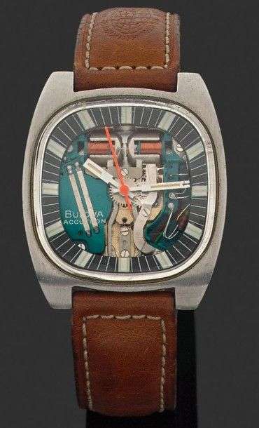 Accutron Vers 1960 Modèle homme en acier à diapason de forme tonneau. Lunette graduée des index de l'heure et des minutes. Aiguilles bâtons, trotteuse centrale orange. Mouvement visible (d'ou son surnom SPACEVIEW) révélant le diapason dont la vibration est entretenue par 2 bobines. Fréquence 360HZ. Boitier 3 corps acier, fond vissé étanche. Mise à l'heure en dessous. Pile 1,35volt. Bon état. Dim 37x37mm.