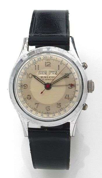 Modèle homme en métal chromé. Cadran argenté, chiffres arabes et aiguilles squelettes. Triple quantième. Remontage manuel. Boitier étanche 2 corps. Diam 32mm.