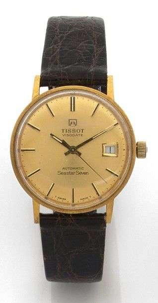 Modèle homme automatique en or 18K. Cadran champagne, index et aiguilles bâtons. Mouvement automatique, dateur à 3h. Boitier monobloc. Fonctionne. Diam 33mm. Poids brut 37,1 gr.