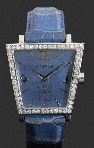 Grand modèle de dame asymétrique en acier joaillerie. Cadran nacre, index mixte, aiguilles dauphines. Mouvement quartz. Boitier 2 corps. Lunette entourage diamants. Petite trotteuse à 6h. Bracelet croco bleu, boucle ardillon acier. Dim 28x40x45 mm