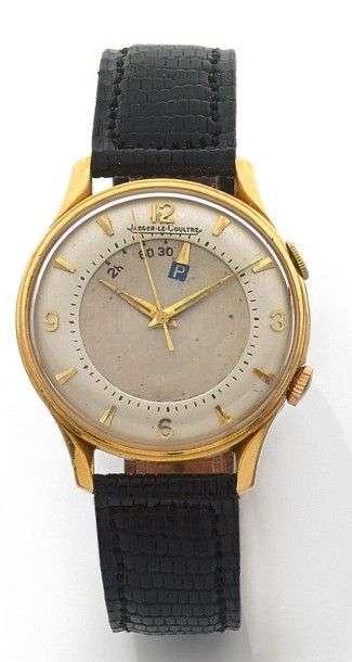 Memovox Vers 1950. N°141503 Modèle homme rond en or 18K. Cadran argenté, index mixtes, aiguilles dauphines. Mouvement cal 814, freq 18000 alt/h. Fonction réveil, disque parcmètre non d'origine. Boitier 2 corps. Fonctionne. Diam 33mm. Poids brut 39,2 gr.