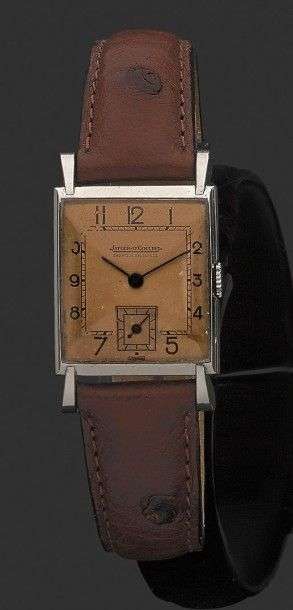 N° 239574. Modèle homme rectangulaire en acier. Cadran or, chiffres arabes, aiguilles bâtons. Mouvement cal 11U, freq 18000 alt/h. Boitier 2 corps. Fonctionne. Dim 22x27mm.