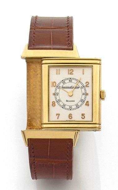 Reverso 2 Vers 1980. Modèle homme en or 18K. Cadran argenté, chiffres arabes appliques, aiguilles feuilles or. Boitier 3 corps. Mouvement mécanique, freq 21600 alt/h. Fonctionne, bon état. Poids brut 41,4 gr. Dim 23x33 mm. Ce modèle rare se distingue par ses 2 godrons parallèles au lieu de 3 d'ordinaire et marque la première tentative de renaissance de la Reverso. En pleine tourmente de crise horlogère Suisse à la fin des années 70, cette Reverso ne pu s'imposer avec brio comme celle que nous connaissons aujourd'hui. Elle représente une étape technique déterminante de son avènement du début des années 90. Cette série est souvent considérée comme le Phénix de la Reverso par les collectionneurs.