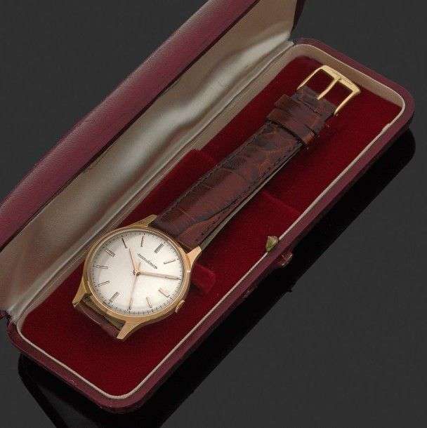 Modèle homme or 18K rond. Cadran argenté, index et aiguilles bâtons or. Boitier fond clippé, deux corps. N°158853. Mouvement cal R478/C. Freq 18000Alt/h. Boucle ardillon or. Fonctionne, bon état. Ecrin cuir rouge d'origine. Diam 33mm. Poids brut 41,3 gr.