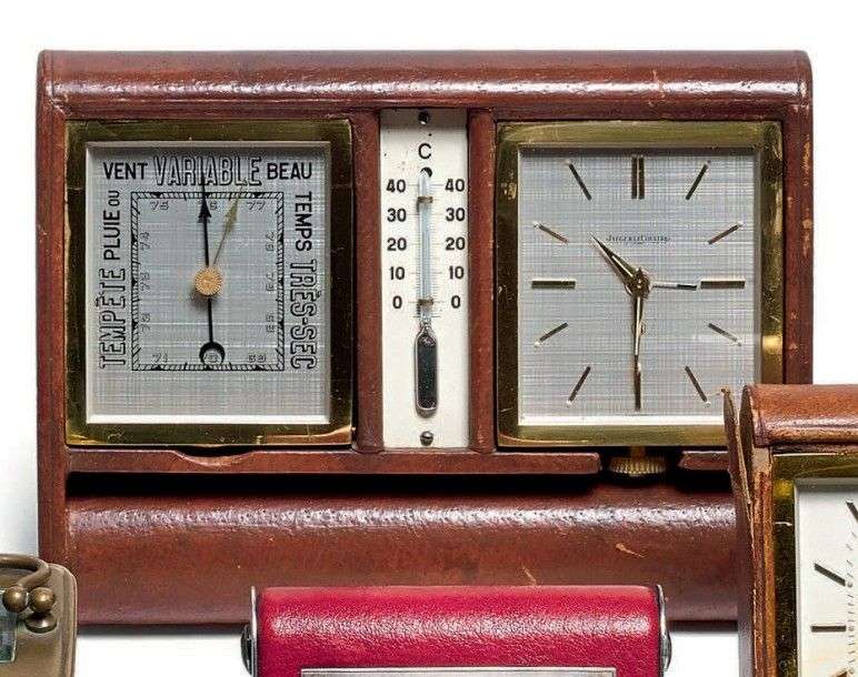 Ados baromètre thermomètre. Réveil de voyage 8 jours gainé de cuir marron. Cadran argenté satiné, index bâtons, aiguilles dauphines. Second module formant baromètre. Thermomètre à mercure au centre. Se referme complètement pour le voyage. Remontoir et mise à l'heure à 6h. Dans l'état. Fonctionne. Dim 11x14 cm