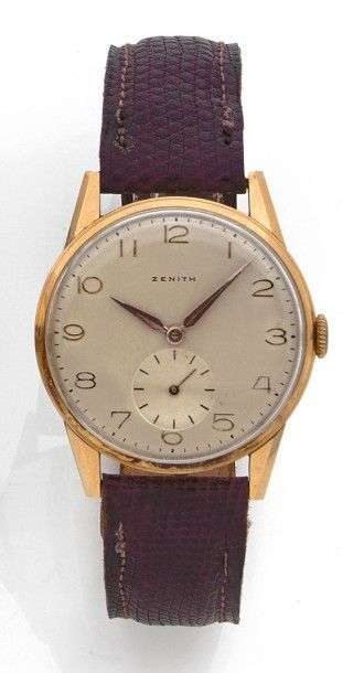 Modèle homme en or jaune ronde18K. Cadran argenté, Chiffres arabes, aiguilles Alpha. Mouvement mécanique. Freq 18000 alt/h. Boitier 3 corps, petite trotteuse à 6h. Fonctionne. Diam 32 mm. Poids brut 32,3 gr.