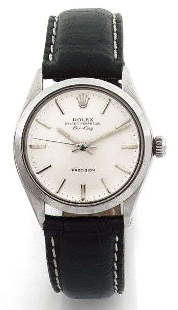 Air King Vers 1970. Ref 5500. 3201354 Modèle homme en acier, bracelet Oyster. Cadran argenté, index et aiguilles bâtons. Mouvement automatique cal 1570, Freq 19600 alt/h Boitier 2 corps, fond étanche. Fonctionne, bon état. Diam 35 mm.