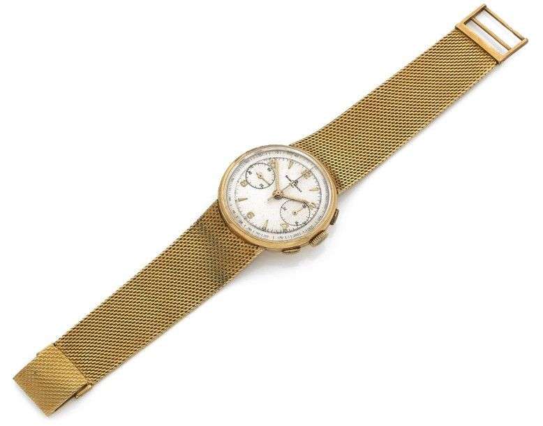 Chronographe homme tout or 18k. Cadran argenté, chiffres arabes et aiguilles bâtons. Mouvement Cal on 48. Freq 18000 alt/h. Totalisateur des minutes à 3h. Echelle tachymètre. Boitier 3 corps. Fonctionne. Cadran signé. Diam 35 mm. Poids brut 94 gr.