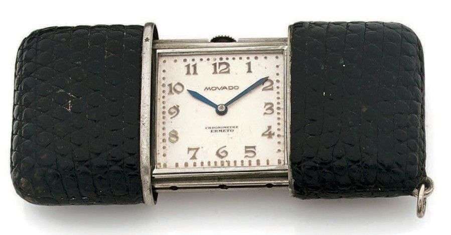 Ermeto non stop Vers 1950. Modèle en acier or gainerie lezard noir. Cadran argenté, chiffres arabes, aiguilles feuilles acier bleui. remontage automatique à la consultation lorsque l'Ermeto est déployé. Mouvement à ancre, Freq 18000 alt/h. Chevalet mobile au dos. Fonctionne. Dim 35 x 75 mm déployé.