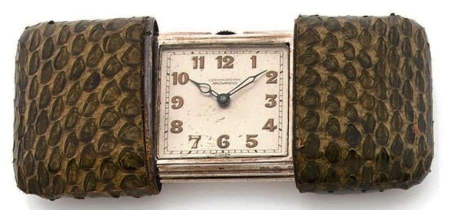 Ermeto non stop Vers 1940. Modèle en argent gainerie serpent. Cadran argenté, chiffres arabes, aiguilles squelettes luminescentes remontage automatique à la consultation lorsque l'Ermeto est déployé Mouvement à ancre, Freq 18000 alt/h. Fonctionne. Dim 35 x 75 mm déployé.
