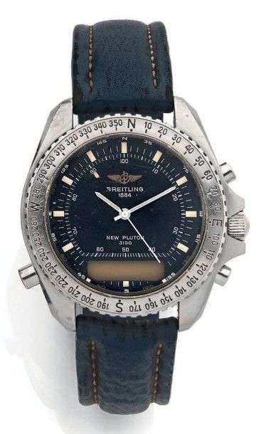 New Pluton Vers 1990. Modèle d'aviation en acier. Cadran bleu, index et aiguilles bâtons, affichage mixte: Analogique et digital par écran cristaux liquides. Lunette tournante graduation boussole. Mouvement quartz. Bracelet requin, boucle déployante acier. Ne fonctionne pas, pile? Diam 41mm