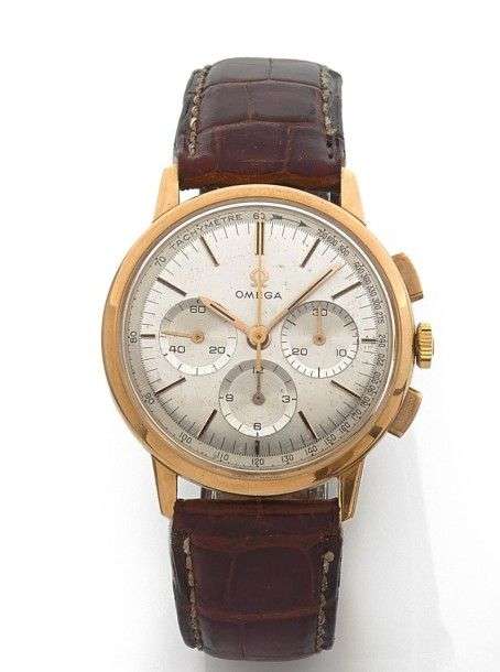 Ref 101010 65 Chronographe rond en or rose 18 carats. Cadran argenté 3 compteurs, totalisateur 30 minutes et 12 heures. Index appliques bâtons or et aiguilles bâtons or. Boitier trois corps, anses droites. Poussoirs carrés. Mouvement Cal 321. Fréquence 18000 alt/h. Fonctionne, très bon état. Poids brut 45,3gr. Diam 35mm.