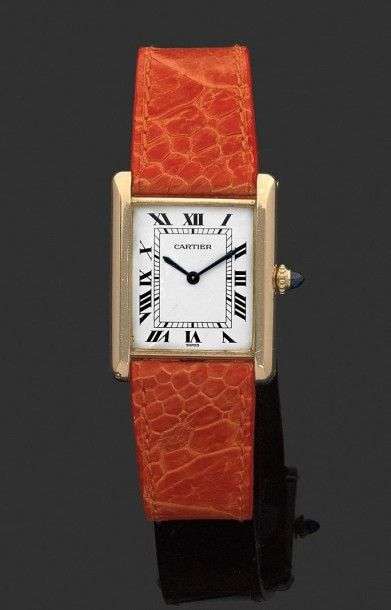 Tank. Vers 1960. N° 960100441 Modèle homme en or 18k. Cadran blanc, chiffres Romain, aiguilles feuilles. Mouvement mécanique. Freq 18000 alt/h. Boitier 2 corps. Fonctionne. Dim 22x24mm. Poids brut 28,4 gr.