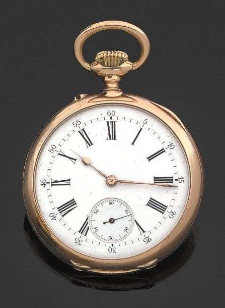 Montre de gousset en or 18k. Cadran émail, chiffres arabes, aiguille Breguet. Echappement à ancre. Boite à charnière. Accompagnée de sa chaine giletière. Poids total brut 94,5 Diam 51mm