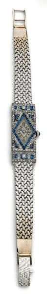Modèle joaillerie tour de bras tout or blanc 18k et platine. Cadran argenté, chiffres arabes, aiguille bâtons. Mouvement mécanique. Boitier 2 corps, lunette entourage saphir et diamants. Dim 28 mm. L 15 cm. Poids brut 33gr.