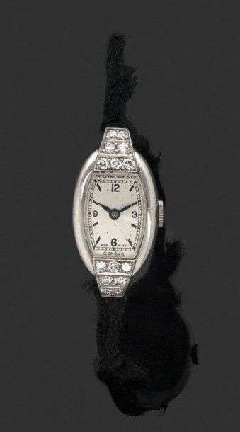 Modèle de dame en platine et diamants. Cadran argenté, chiffres arabes, aiguilles acier. Mouvement ovale N°824868. Fonctionne. Boitier 2 corps, attaches cordonnets. Poids brut 14 gr. Dim 14x31 mm.