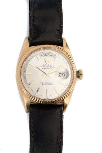 Day date Vers 1972. Ref 1803. N° 465062 Modèle homme en or jaune automatique. Cadran argenté, index appliques et aiguilles bâtons. Mouvement cal 1555.Freq 19800 alt/h. Boitier 3 corps, fond étanche. Fonctionne, bon état. Diam 36mm. Poids brut 59,9 gr. fonctionne, bon état