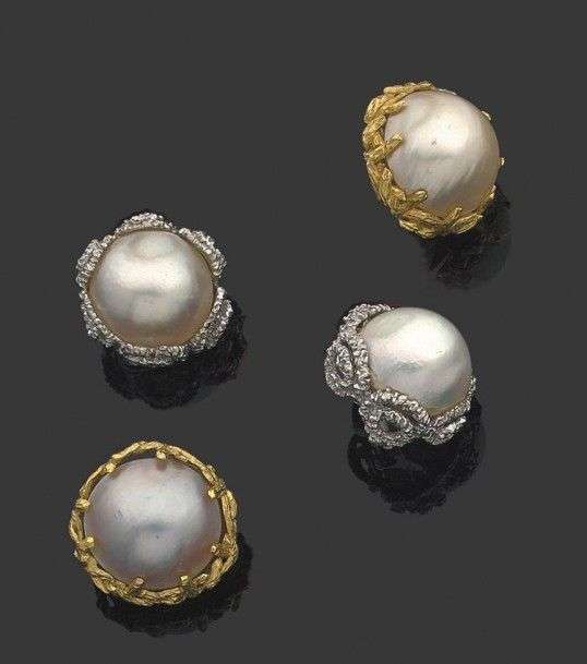 Ensemble de deux paires de clips d'oreilles en or jaune et or gris 18k sertis de perles mabes. Poids brut: 42 gr