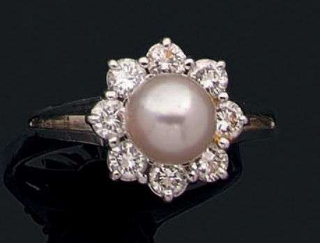 Bague en or gris 18k ornée d'une perle de culture dans un entourage de diamants de taille brillant. Tour de doigt: 55 Poids brut: 4.8 gr