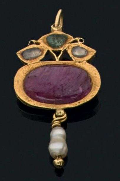 Pendentif indien en or jaune 18k serti d'un cabochon de rubis et d'une perle baroque. Long.: 5 cm env. Poids brut: 10 gr