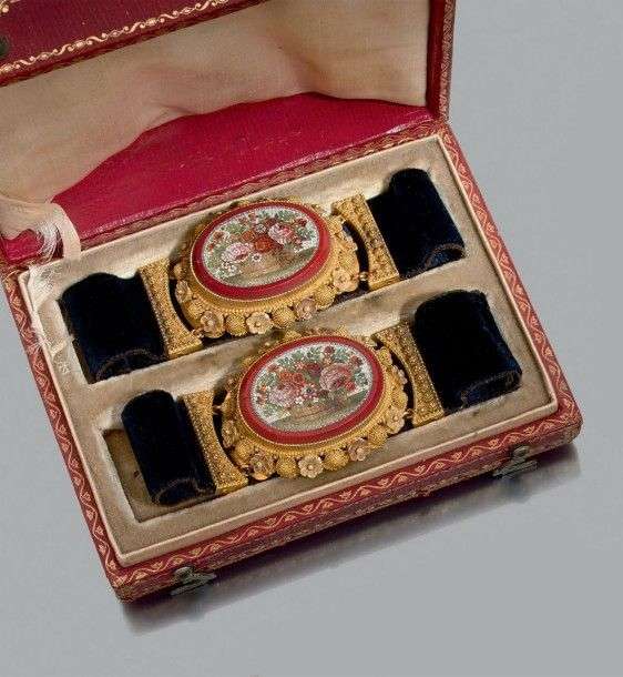 Paire de bracelets composés d'un velours noir et d'un fermoir orné d'une micromosaïque représentant un panier de fleurs dans un entourage floral en or jaune et rose 18k. Dans un écrin. Epoque XIXème Long.: 18 cm env. Poids total brut: 41.8 gr A velvet, hard stone, yellow gold pair of bracelet.