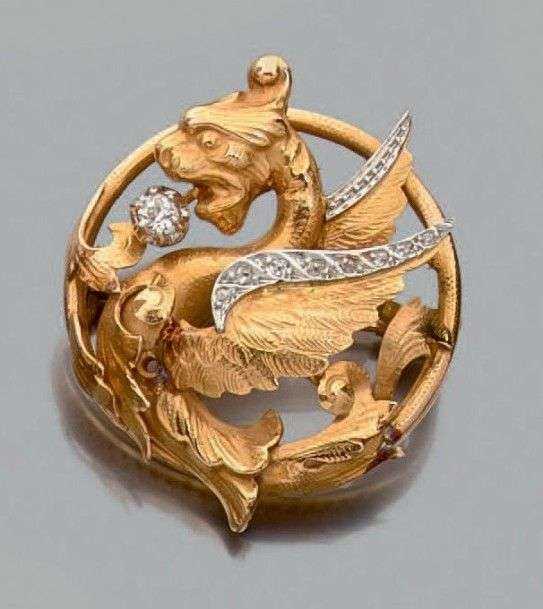Broche "chimère" en or jaune 18k sertie d'un diamant de taille ancienne et