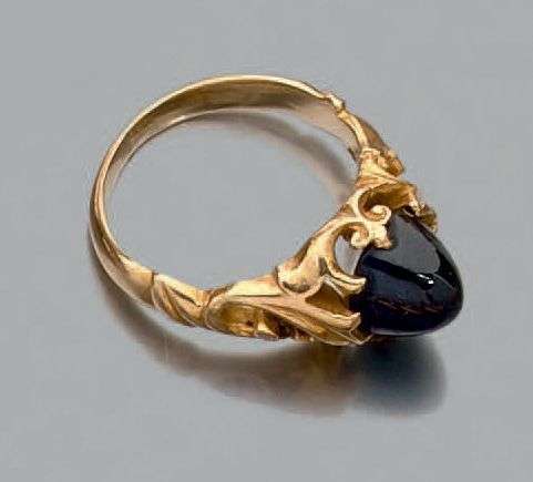 Bague en or jaune 18k ciselée de rinceaux et ornée d'un cabochon de saphir. Tour de doigt: 44 Poids brut: 4.1 gr A sapphire and yellow gold ring.