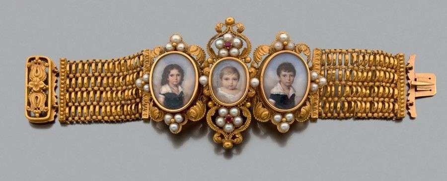 Large bracelet en or jaune 18k orné au centre d'un important motif composé de trois miniatures représentant des enfants, dans un entourage ciselé de feuillage et perles fines. Deux miniatures sont signées Menusier 1812 Poids brut: 67.4gr A fine pearl, miniature and yellow gold bracelet.