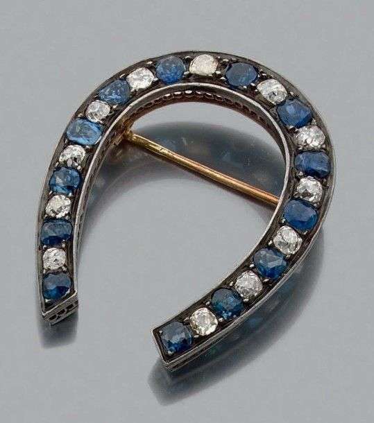 Broche "fer à cheval" en or jaune 18k et argent sertie d'une alternance de diamants de taille ancienne et de saphirs.Epoque XIXème Haut.: 5 cm env. Larg.: 4 cm env. Poids brut: 15.1 gr A diamond, sapphire, silver and yellow gold brooch.