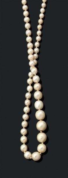 Rang composé d'une chute de 87 perles fines en chute. Poids brut: 14.13 gr Accompagné d'un certificat LFG N°314693 attestant perles fines, eau de mer. Diam.: 3.3 - 8.3 mm env. A fine pearl necklace.