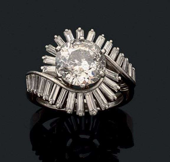 Bague en platine sertie au centre d'un diamant de taille ancienne dans un entourage à enroulement serti de diamants baguettes. Poids du diamant central: 3 cts env. Poids des diamants baguettes: 1 ct env. Tour de doigt: 51 Poids brut: 10.9 gr A diamond and platinium ring.