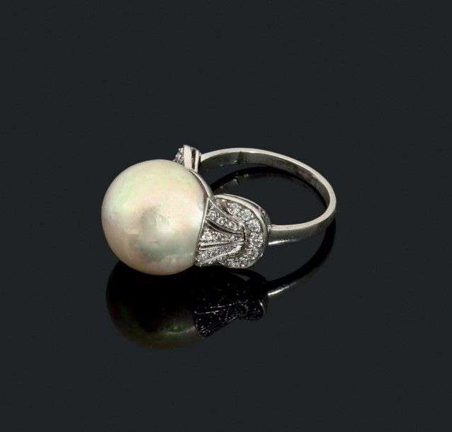 Bague en platine ornée d'une importante perle fine baroque épaulée de deux motifs stylisant une fleur de lotus sertie de brillants. Tour de doigt: 53 Poids brut:10.27gr Accompagnée d'un certificat du LFG N°323852 attestant perle fine, eau de mer. Diam: 14.4 - 14.5 x 13.4 mm A fine pearl, diamond and platinium ring.