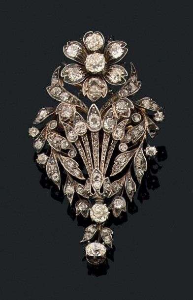 Broche-pendentif en or jaune 18k et argent stylisant une gerbe de fleurs pavée de diamants de taille ancienne et de taille rose. Epoque XIXème. Haut.: 6 cm env. Poids brut: 23.1 gr A diamond, silver and yellow gold brooch-pendant.