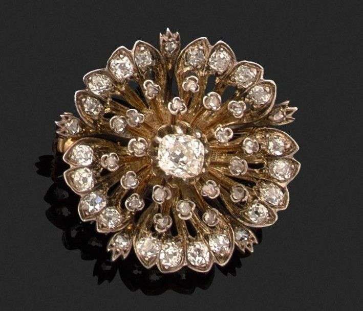 Broche "fleur" en or jaune 18k et argent sertie de diamants de taille anci