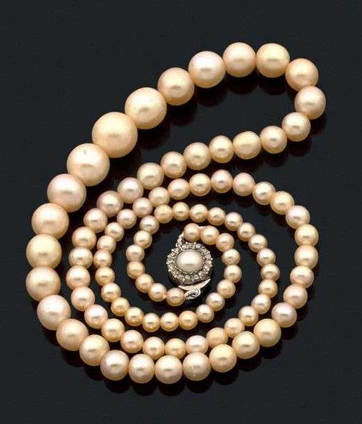 Collier composé de 97 perles fines en chute. Fermoir serti d'une demi perl