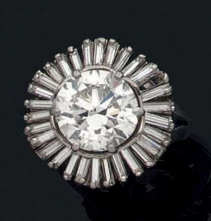 Bague en platine sertie d'un diamant de taille ancienne dans un entourage de diamants baguettes. Signée Monture Boucheron. Dans un écrin. Poids du diamant central: env 3.75 cts. Manque un diamant baguette. Tour de doigt: 52.5 Poids brut: 12.1 gr (#)