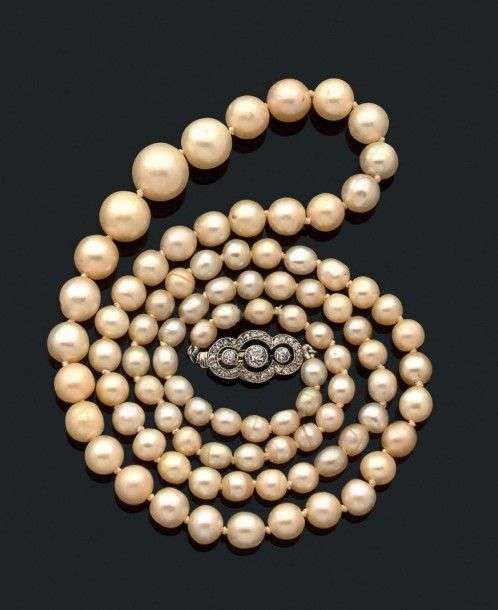 Collier composé de 91 perles fines en chute. Fermoir en or gris ajouré serti de diamants. Poids brut: 17.98gr Accompagné d'un certificat LFG N°314805 attestant perles fines, eau de mer. Diam.: 3.8 - 8.6 mm env. A fine pearl, diamond and white gold necklace.