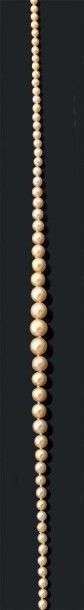 Collier composé de 89 perles fines en chute. Fermoir baton en or gris. Poi