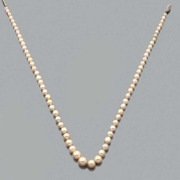 Collier composé de 67 perles fines en chute. Fermoir en or gris serti de d