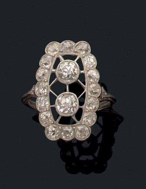 Bague en platine sertie de deux diamants de taille ancienne dans un entourage ajouré de diamants. Tour de doigt: 57 Poids brut: 5.4 gr A diamond and platinium ring.
