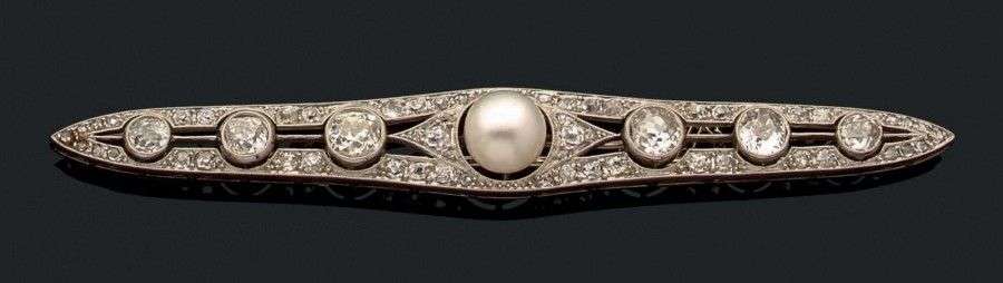 Grande broche en or gris 18k sertie au centre d?une perle fine (ou demi perle?) épaulée de diamants de taille ancienne dans un entourage ajouré serti de brillants. Poids brut: 12.39gr Long.: 9 cm A fine pearl, diamond and white gold brooch.