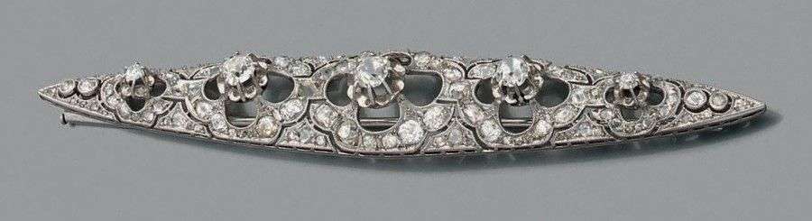 Grande broche de forme navette en or gris 18k et platine à décor ajouré serti de diamants de taille ancienne et diamants taillés en rose. Long.: 9.5 cm Poids brut: 16.3gr A diamond, white gold and platinium brooch.