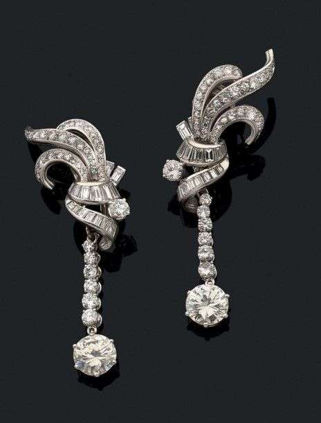 Paire de pendants d'oreilles en or gris 18k et platine composés d'une volute sertie de diamants de taille baguette et brillant retenant en pampille une chute de diamants rehaussée d'un diamant de taille moderne plus important. Long.: 6.5 cm env. - Pampilles amovibles Poids brut: 18.2 gr Accompagnée d?un certificat de l?IGL attestant Poids des deux diamants importants: 2.11 et 2.10 carats Couleur: I - J Pureté: VS1 - VS2 Poids total des diamants: 11.2 cts env A diamond, white gold and platinium pendant of earrings.